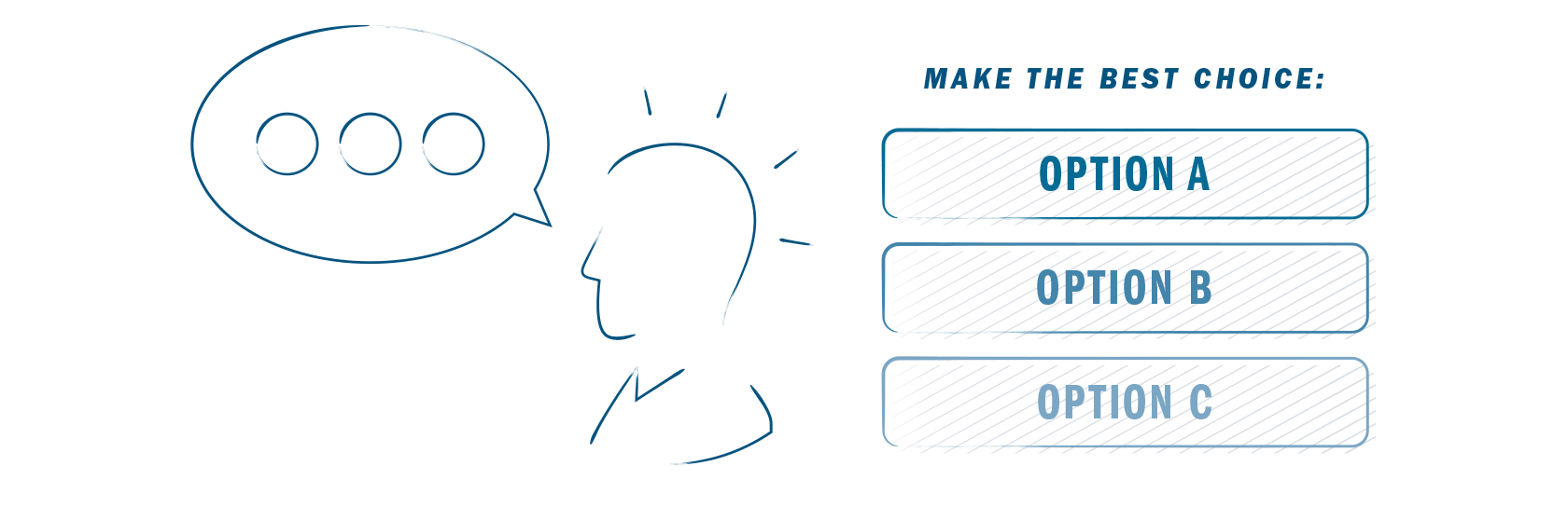 Most people think choice-based simulations work like the real world. Imagine a simulated conversation with a potential customer. You present your learner with a character and provide dialogue choices. Each time the learner chooses a response, the character responds with a different statement, facial expression, and tension rating. The conversation builds as the learner makes more and more responses.