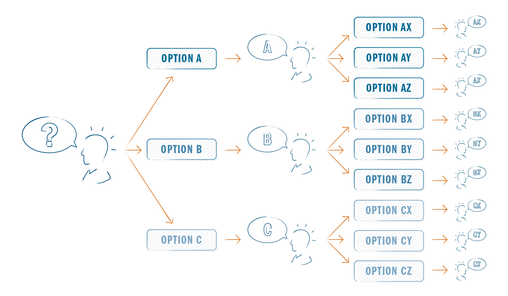 Plus, there’s a high risk that the learner will bypass critical learning points in the conversation. For example, if a critical learning point occurs in Choice AZ, but the learner selects Choice C and goes down that path, the critical learning point will be completely missed.